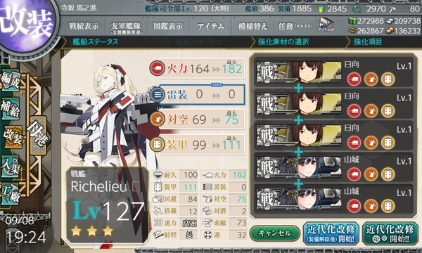 2024-09-10 五月の恋 日々 艦これ 仕事で苗場へ。 まだまだ陽射しは厳しいですが、吹く風はすっかり 秋のそれへと変わりつつあります。 なんとかE-2-3をクリアできた艦これです。 次はいよいよE-3ですね。 さて、例のアイテムが2つ揃いましたのでいよいよ フランス戦艦の改造です。 多大な資源をつぎ込んでリシュリューが遂に改二に。 ここまで長かった。 そして近代化改修を。 次のE-3から投入予定ですが、果たしてどれだけの 活躍を見せてくれるのでしょうか。 それでは。